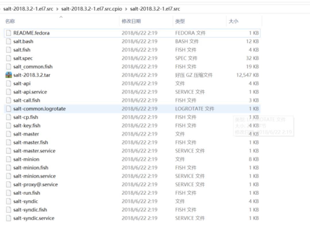 5. 解压 salt-2018.3.2-1.el7.src.rpm,如果要修改salt-2018.3.2.tar.gz源码,修改完后需要压缩包格式要和原来保持一致。