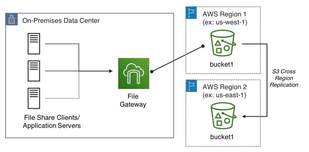 图 8: 私有数据中心中的文件网关,使用CRR跨AWS区域复制对象