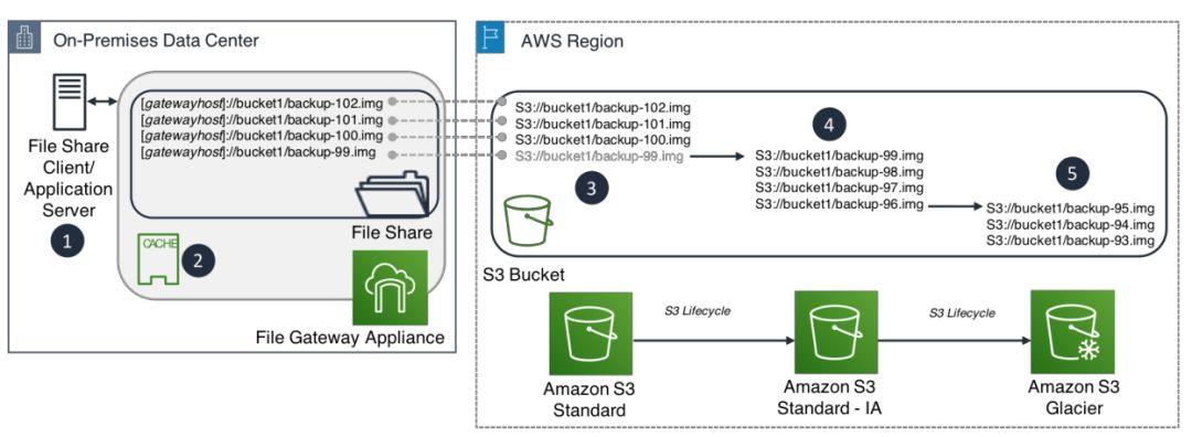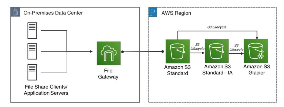 Amazon S3提供了许多存储类。今天,AWS Storage Gateway文件网关本身支持S3 Standard,S3 Standard-不常访问和S3 One Zone-IA。Amazon S3生命周期策略可以跨存储层自动管理数据,也可以根据对象的年限使对象失效。