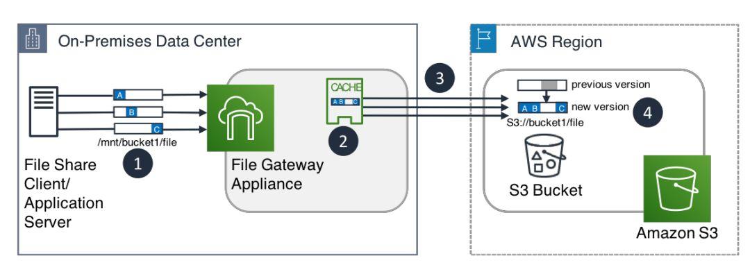 当修改现有文件时,文件网关只将新写的字节传输到关联的AmazonS3 bucket。它使用Amazon S3 API调用,结合新上传的字节,从以前的版本构造一个新对象。这减少了客户端修改文件网关中现有文件时需要传输的数据量。