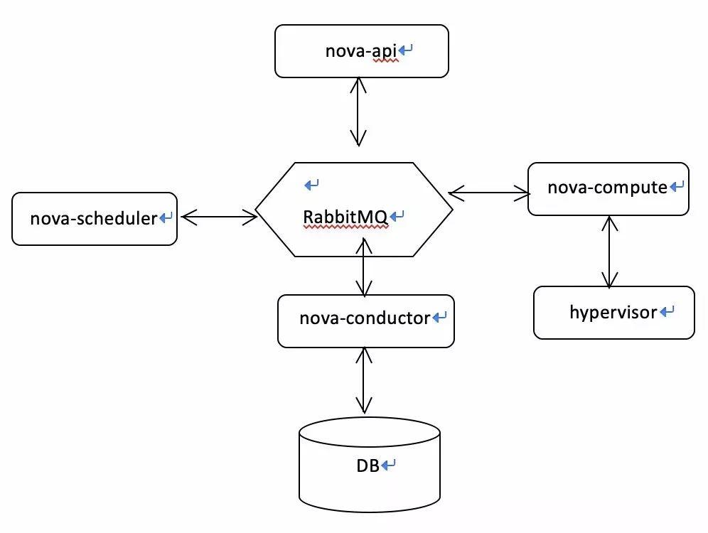 OpenStack Nova是计算模块,负责管理虚拟机的生命周期。Nova主要由nova-api、nova-cell、nova-conductor、nova-scheduler和nova-compute等组件组成。通常生产环境会把Nova划分为控制节点和计算节点两种节点来部署,控制节点上主要运行nova-api、nova-conductor、nova-scheduler服务,计算节点上主要运行nova-compute和hypervisor服务。其中,nova-api主要对外提供restful API服务;nova-cell主要是用来解决横向扩展集群规模带来的RabbitMq和MariaDB瓶颈问题;nova-conductor是nova的中枢神经,直接操作数据库;nova-scheduler是nova创建虚拟机的调度器,;nova-compute是创建管理虚拟机生命周期的真正组件,直接调用hypervisor;DB模块一般采用MariaDB集群,存储nova生命周期的所有持久化信息;hypervisor支持KVM、Xen、Hyper-v、LXC等虚拟化技术,是管理虚拟机的最终组件。上述Nova各组件是通过RabbitMQ消息队列通信的,RabbitMQ可以使各组件模块相互解耦、任务异步、并且可以起到流量削峰的作用。Nova架构如下图所示: