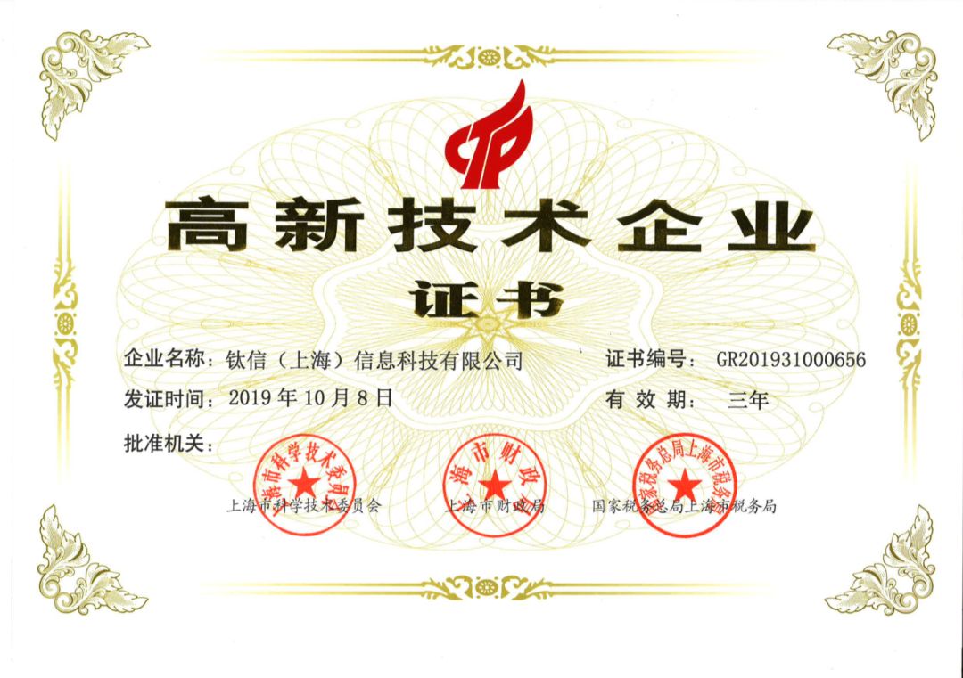 2020年3月,新钛云服正式拿到了“高新技术企业证书”。通过“高新技术企业”认定标志着新钛云服在企业服务领域具有较强的技术创新能力,高端技术开发能力。