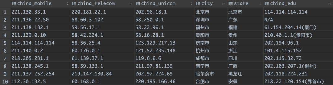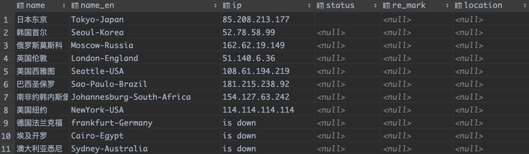 def get_data():conn = psycopg2.connect(dbname="数据库名称", user="数据库用户名", password="数据库密码",host="填写数据库地址", port="5432")cursor = conn.cursor()cursor.execute("select state, city, china_telecom, china_unicom, china_mobile, china_edu from ip_test;")ip_test = cursor.fetchall()cursor.execute("select name, name_en, ip from ip_test_international;")ip_test_int = cursor.fetchall()cursor.close()conn.close()return ip_test, ip_test_intdef output_config():china_telcom = []china_unicom = []china_mobile = []int_ip = []for i in get_data()[0]:if 'is down' != (i[2].rstrip()):china_telcom.append(('+++ dianxin-' + ''.join(x[0] for x in lazy_pinyin(i[0].rstrip().rstrip('市'))) + '-' + str(random.randint(1, 10000)), 'menu = ' + i[0].rstrip().rstrip('市') + i[1].rstrip().rstrip('市') + '电信', 'title = ' + ''.join(lazy_pinyin(i[0].rstrip().rstrip('市'))) + '-' + ''.join(lazy_pinyin(i[1].rstrip().rstrip('市'))) + '-' + i[2].rstrip(), 'host = ' + i[2].rstrip()))for i in get_data()[0]:# print(i[3].rstrip())if 'is down' != (i[3].rstrip()):china_unicom.append(('+++ liantong-' + ''.join(x[0] for x in lazy_pinyin(i[0].rstrip().rstrip('市'))) + '-' + str(random.randint(1, 10000)), 'menu = ' + i[0].rstrip().rstrip('市') + i[1].rstrip().rstrip('市') + '联通', 'title = ' + ''.join(lazy_pinyin(i[0].rstrip().rstrip('市'))) + '-' + ''.join(lazy_pinyin(i[1].rstrip().rstrip('市'))) + '-' + i[3].rstrip(), 'host = ' + i[3].rstrip()))for i in get_data()[0]:if 'is down' != (i[4].rstrip()):china_mobile.append(('+++ yidong-' + ''.join(x[0] for x in lazy_pinyin(i[0].rstrip().rstrip('市'))) + '-' + str(random.randint(1, 10000)), 'menu = ' + i[0].rstrip().rstrip('市') + i[1].rstrip().rstrip('市') + '移动', 'title = ' + ''.join(lazy_pinyin(i[0].rstrip().rstrip('市'))) + '-' + ''.join(lazy_pinyin(i[1].rstrip().rstrip('市'))) + '-' + i[4].rstrip(), 'host = ' + i[4].rstrip()))for i in get_data()[1]:if 'is down' != (i[2]):int_ip.append(('++ ' + ''.join(i[1]), 'menu = ' + i[0], 'title = ' + i[1] + '-' + i[2], 'host = ' + i[2]))return china_telcom, china_unicom, china_mobile, int_ip
