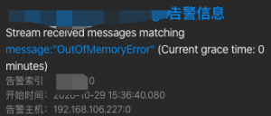 一些关键指标的日志需要配置告警,否则会造成很严重的故障。如:JAVA应用内存溢出必须要马上告警。告警原理是通过日志消息中匹配指定字符串内容就告警。实际告警结果如下: