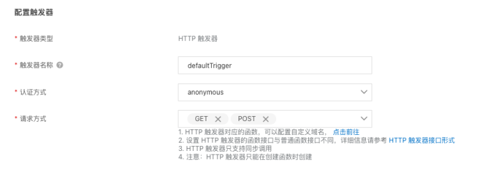 这里主要注意函数入口这个配置,Handler 的格式为 [文件名].[函数名]。例如创建函数时指定的 Handler 为 index.handler,那么文件名为 index.py,入口函数为 handler。 配置触发器