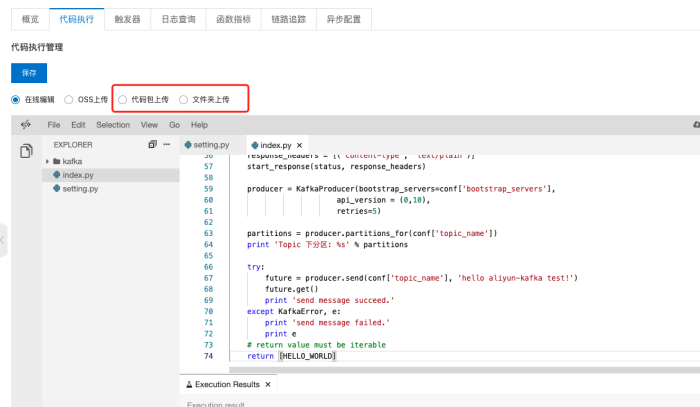 return [HELLO_WORLD]备注:上面的函数脚本分别参考了阿里云的函数计算Hello World示例和python连接kafka示例,参考url如下: Hello World示例https://help.aliyun.com/document_detail/74756.html?spm=a2c4g.11186623.6.573.2be3dc876slGKm python连接kafka示例 https://code.aliyun.com/alikafka/aliware-kafka-demos/blob/master/kafka-python-demo/vpc/aliyun_kafka_producer.py Hello World示例必须要,因为这个是Http函数,需要加http请求参数和返回的状态码等信息。environ, start_response这两个参数是必选项。不加参数无法通过。具体信息可以查看帮助文档。 代码上传