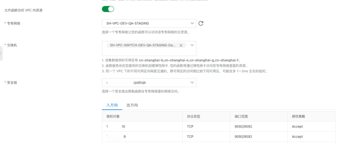 配置kafka所在安全组允许被函数计算内网地址访问 由于函数计算地址用的是域名,通过ping得到函数计算内网地址,然后用大段的子网覆盖它,避免ip变更导致无法访问