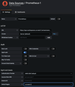 kubectl get secrets grafana-for-amp -n grafana -o jsonpath='{.data.admin-password}'|base64 --decode在可视化Grafana中的指标之前,必须使用一个或多个数据源对其进行配置。在这里,我们将在Amazon Managed Service for Prometheus中将工作区指定为数据源,如下所示。在URL字段中,指定AMP工作区详细信息页面中显示的Endpoint –query URL,在URL末尾不带/api/v1/query字符串。