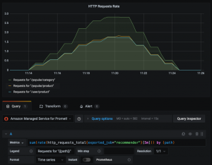 sum(rate(http_requests_total{exported_job=”recommender”}[5m])) by (path)下图说明了如何根据Prometheus Counter中捕获的不同路径标签在Grafana中可视化该指标: