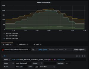△PromQL和指标可视化除了从应用程序工作负载中收集的服务指标外,我们还可以查询Prometheus捕获的Kubernetes集群中所有容器和节点的系统指标。例如,Prometheus计数器node_network_transmit_bytes_total捕获从群集的每个节点传输的数据量。下图使用Prometheus查询将每个节点的数据传输速率可视化,如下所示: