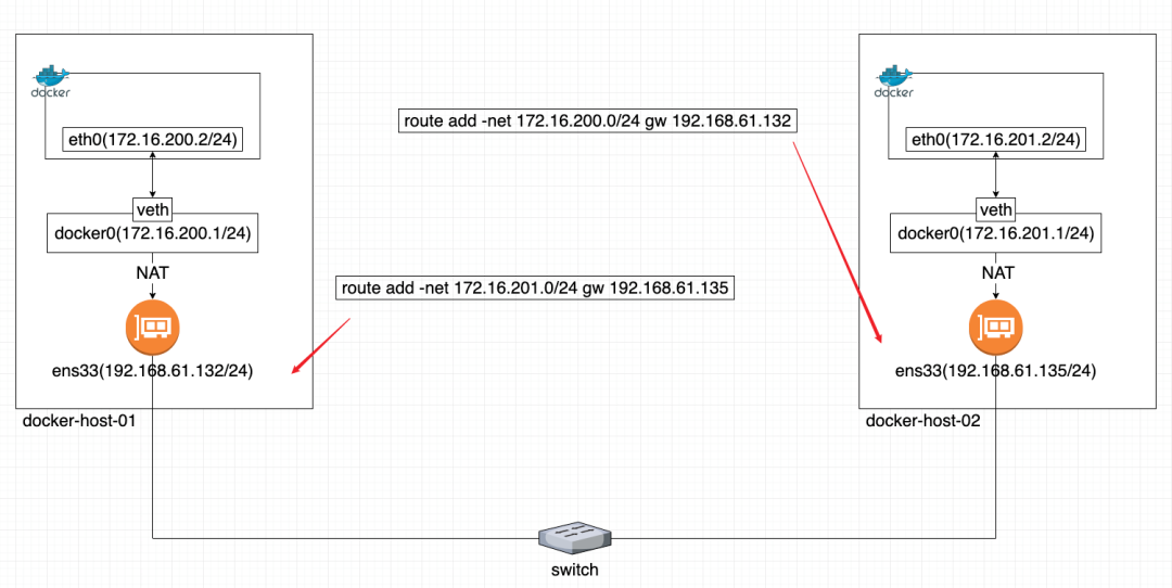 [root@docker-host-01 ~]# route -nKernel IP routing tableDestination   Gateway     Genmask     Flags Metric Ref   Use Iface0.0.0.0     192.168.61.2  0.0.0.0     UG  0   0    0 ens33169.254.0.0   0.0.0.0     255.255.0.0   U   1002  0    0 ens33172.16.200.0  0.0.0.0     255.255.255.0  U   0   0    0 docker0192.168.61.0  0.0.0.0     255.255.255.0  U   0   0    0 ens33[root@docker-host-01 ~]# route add -net 172.16.201.0/24 gw 192.168.61.135[root@docker-host-01 ~]# route -nKernel IP routing tableDestination   Gateway     Genmask     Flags Metric Ref   Use Iface0.0.0.0     192.168.61.2  0.0.0.0     UG  0   0    0 ens33169.254.0.0   0.0.0.0     255.255.0.0   U   1002  0    0 ens33172.16.200.0  0.0.0.0     255.255.255.0  U   0   0    0 docker0172.16.201.0  192.168.61.135 255.255.255.0  UG  0   0    0 ens33192.168.61.0  0.0.0.0     255.255.255.0  U   0   0    0 ens33