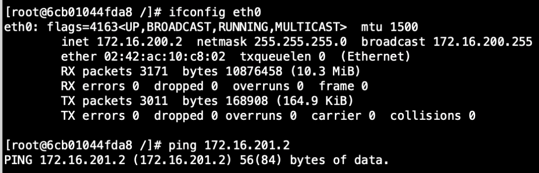 [root@docker-host-01 ~]# docker run  --name host-01-docker -it centos /bin/bash[root@6cb01044fda8 /]# yum install -y net-tools  #安装工具查看ip和网关[root@6cb01044fda8 /]# ifconfig eth0eth0: flags=4163<UP,BROADCAST,RUNNING,MULTICAST>  mtu 1500     inet 172.16.200.2  netmask 255.255.255.0  broadcast 172.16.200.255     ether 02:42:ac:10:c8:02  txqueuelen 0  (Ethernet)     RX packets 3168  bytes 10876332 (10.3 MiB)     RX errors 0  dropped 0  overruns 0  frame 0     TX packets 2970  bytes 165058 (161.1 KiB)     TX errors 0  dropped 0 overruns 0  carrier 0  collisions 0[root@6cb01044fda8 /]# route -nKernel IP routing tableDestination   Gateway     Genmask     Flags Metric Ref   Use Iface0.0.0.0     172.16.200.1  0.0.0.0     UG  0   0    0 eth0172.16.200.0  0.0.0.0     255.255.255.0  U   0   0    0 eth0