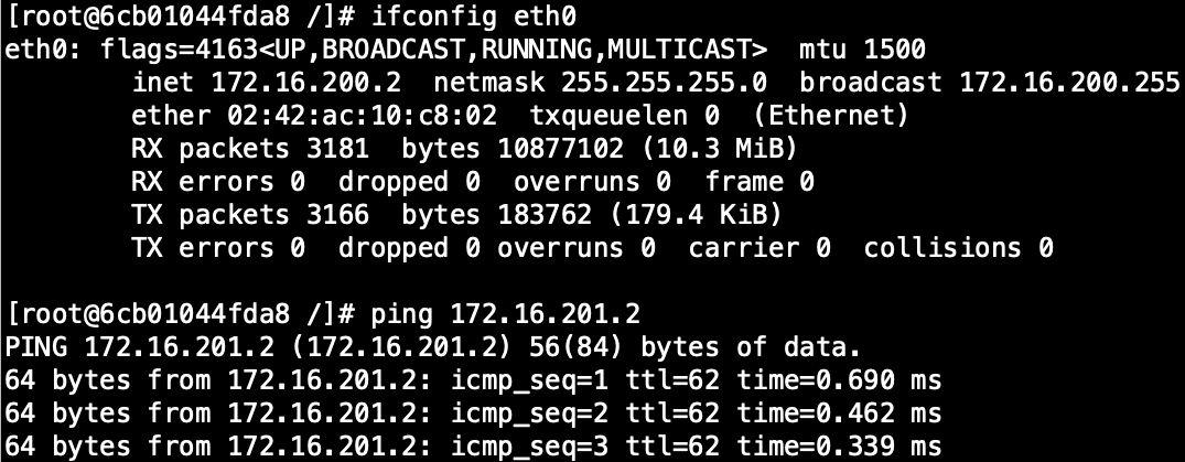 [root@docker-host-02 ~]# docker run  --name host-02-docker -it centos /bin/bash[root@f52ed4088844 /]# yum install -y net-tools[root@f52ed4088844 /]# ifconfig eth0eth0: flags=4163<UP,BROADCAST,RUNNING,MULTICAST>  mtu 1500     inet 172.16.201.2  netmask 255.255.255.0  broadcast 172.16.201.255     ether 02:42:ac:10:c9:02  txqueuelen 0  (Ethernet)     RX packets 3436  bytes 10890638 (10.3 MiB)     RX errors 0  dropped 0  overruns 0  frame 0     TX packets 3159  bytes 175122 (171.0 KiB)     TX errors 0  dropped 0 overruns 0  carrier 0  collisions 0[root@f52ed4088844 /]# route -nKernel IP routing tableDestination   Gateway     Genmask     Flags Metric Ref   Use Iface0.0.0.0     172.16.201.1  0.0.0.0     UG  0   0    0 eth0172.16.201.0  0.0.0.0     255.255.255.0  U   0   0    0 eth0
