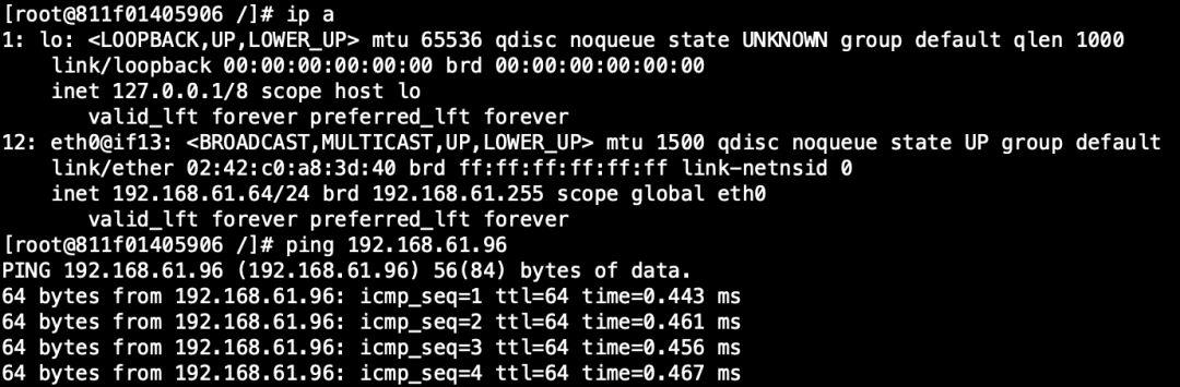 [root@docker-host-01 ~]# docker run -it centos /bin/bash[root@811f01405906 /]# ip a1: lo: <LOOPBACK,UP,LOWER_UP> mtu 65536 qdisc noqueue state UNKNOWN group default qlen 1000   link/loopback 00:00:00:00:00:00 brd 00:00:00:00:00:00   inet 127.0.0.1/8 scope host lo    valid_lft forever preferred_lft forever12: eth0@if13: <BROADCAST,MULTICAST,UP,LOWER_UP> mtu 1500 qdisc noqueue state UP group default   link/ether 02:42:c0:a8:3d:40 brd ff:ff:ff:ff:ff:ff link-netnsid 0   inet 192.168.61.64/24 brd 192.168.61.255 scope global eth0    valid_lft forever preferred_lft forever