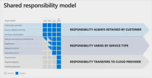 但是,云供应商并不完全负责保护云和客户数据。 责任共担模型可能因云供应商而异,它描述了是供应商还是客户负责保护云的不同方面。根据组织使用的是在云中运行的软件即服务 (SaaS) 应用程序、平台即服务 (PaaS) 产品还是基础结构即服务 (IaaS) 产品,责任量存在差异。例如,以下是Microsoft Azure的共担责任模型:
