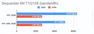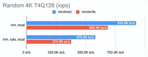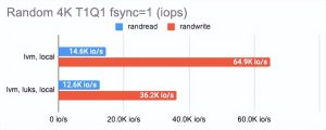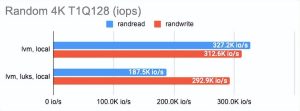 LINSTOR 可以使用 LUKS 加密卷,我们很好奇这种加密在性能损失方面的成本是多少。事实证明,对 LUKS 的影响很小:对于偶尔的随机读/写或顺序操作,性能几乎没有变化,而对于一系列随机操作,性能仅减半。