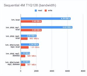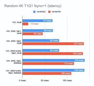 - 在两个副本的情况下,其中一个在本地,与 “raw” 设备相比,性能下降了三倍,而延迟增加了一倍(实际上这只是 CPU 的开销)。