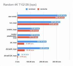 ZFS 结果明显更差。我们试图通过调整块大小来调整它。不幸的是,它对结果几乎没有影响(我们测试了 512、4K、32K 和 512K 块大小;默认值为 8K)。较小的块大小略微提高了性能,但延迟也显着增加。更大的块大小增加了顺序读写速度,但这不是我们的目标。
