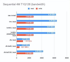 LINSTOR (https://linbit.com/linstor/) 支持不同的后端,包括 LVM、LVMThin 和 ZFS。它们将在下面进行测试。为了进行测试,我们使用了可用的最快磁盘(在节点 3 上)并测量了它们的性能。下面是结果: