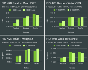 多年来我们遇到的最常见问题之一是用户是否应该在每个闪存驱动器上部署多个 OSD。这个问题比较复杂,因为随着Ceph的发展,这个问题的答案也在不停的变化。早在 Ceph Nautilus 时代,我们通常建议每个闪存驱动器部署2 个甚至 4 个 OSD。当时在每个闪存设备部署多个 OSD 时,特别是在使用 NVMe 驱动器时,会具有很明显的性能优势。 但在 Octopus 和 Pacific 的发布周期中,这一问题的答案也开始发生变化。社区在 OSD 和 BlueStore 代码中引入了多项性能改进,极大地提高了每个 OSD 的性能。随着Pacific 版本的发布,我们也进行了各种测试,以确定我们的建议是否应该改变。