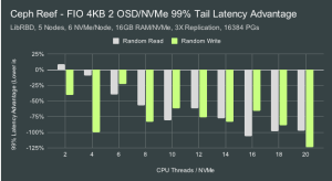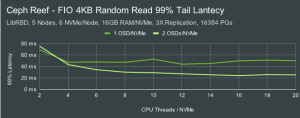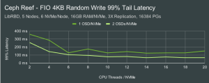 平均延迟减少遵循与我们在 IOPS 中看到的类似模式。在每个 NVMe 有 2 个 OSD 的低 CPU 线程数下,平均延迟稍差(较高),但在 CPU 线程数非常高时,平均延迟明显更好(较低)。 4KB随机99%尾部延迟
