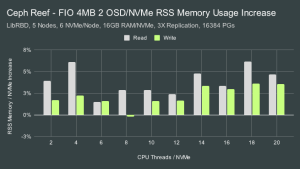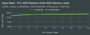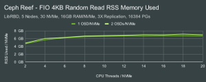 4KB随机内存使用 虽然每个 NVMe 案例的 2 个 OSD 中的 CPU 使用率显着增加,但内存使用率的增加相对较小。通常,与每个 NVMe 使用 1 个 OSD 相比,会有大约 3-6% 的损失。两种配置均未使用此数据集大小的 OSD 可用的全部内存量。