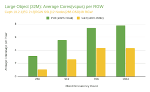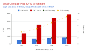 - 限制因素:RGW 上的 CPU 使用率开始上升(768 个 vCPU 的 ~9.8%),但系统仍有空间。跨客户端线程的低延迟和一致的扩展表明,集群可以通过额外的客户端资源/并发来推送更高的 IOPS。