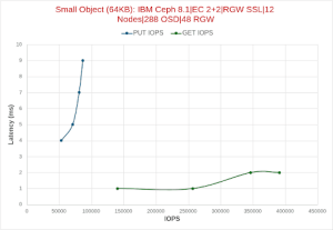 - ~86.6K PUT IOPS 使用相同的配置(64KiB、EC 2+2、带 SSL 的 RGW、12 个节点、1024 个客户端线程)记录。PUT 吞吐量峰值为 ~5.4 GiB/s,完全并发(1024 个客户端线程)时的平均延迟为 ~8 毫秒。