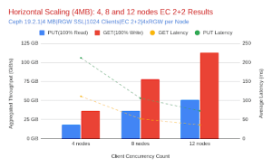 为了评估横向扩展 Ceph 对象网关 (RGW) 的影响,我们使用纠删码 2+2 配置文件、4MB 对象大小和在 RGW 层启用的 SSL 进行了受控测试。之所以选择此特定的 EC 配置文件,是因为它在 4、8 和 12 节点部署中都有效,从而可以进行公平的同类比较。