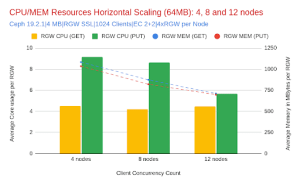 - CPU 和内存资源:Ceph 分布式架构的核心优势在于其能够随集群规模扩大实现单服务资源的摊薄效应。在使用 64 MiB 对象与 1024 并发线程的测试中,我们发现:尽管集群吞吐量提升超三倍,但单 RGW 守护进程的 CPU 与内存使用率随节点增加反而下降。通常因纠删码计算而更耗资源的 PUT 操作中,单 RGW 守护进程的 CPU 使用从四节点时的约 9.2 核心降至十二节点时的仅 5.7 核心;内存使用亦从约 1035 MiB 减少至约 698 MiB。GET 操作呈现相似趋势:单 RGW 内存占用降低约 35%,CPU 使用率始终维持低位。