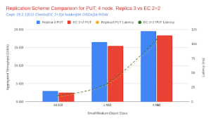 为深入比较复制与纠删码在不同对象下的性能表现,我们在四节点集群上分别采用副本数 3(replica 3)与 EC 2+2 配置对 Ceph RGW 进行测试(网关层启用 SSL)。虽然理想情况下应在十二节点集群进行对比,但由于时间限制,副本数 3 配置仅于四节点环境完成测试。我们计划在支持快速纠删码优化的 Tentacle 功能可用后,使用更大规模部署重新进行基准测试。